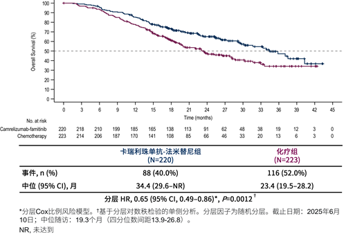 本研究的主要終點分析顯示,卡瑞利珠單抗-法米替尼治療組較化療組顯著延長了PFS和OS。卡瑞利珠單抗-法米替尼治療組 vs 化療組經(jīng)BICR評估的中位PFS為11.1個月 vs 7.5個月(HR=0.68,95% CI:0.53-0.86,P=0.0007)(圖2),中位OS是34.4個月 vs 23.4個月(HR=0.65,95% CI:0.49-0.86,P=0.0012)(圖3)。